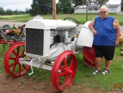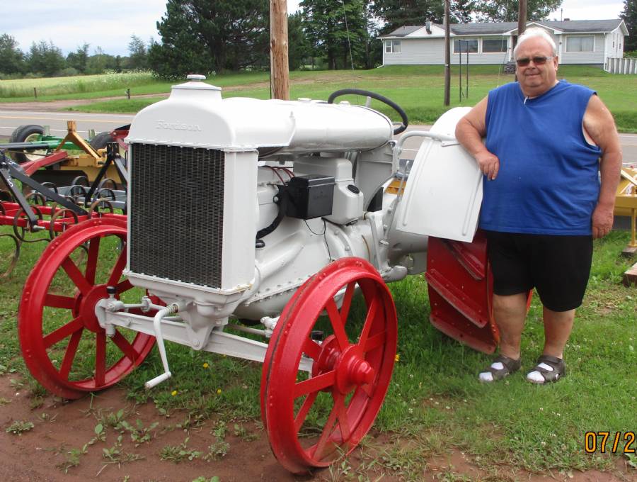 I, Denis Gallant, purchased this tractor from James & Cecil Palmer. Jim's father, Hedley Palmer, bought it new with dual wheels, plough, harrow and disc for $1,200.00. The tractor has 3 forward gears and reverse. Has no power take off. It is 4 cyl gas. The gas tank has 2 compartments because it started on gas and when it got warmed up it changed to kerosene because kerosene was cheaper. When I bought the tractor it was in an old shed. The front axle was in the mud almost to the radiator. I have had it about 20 years and it is now completely rebuilt. The tractor is now 103 years old.