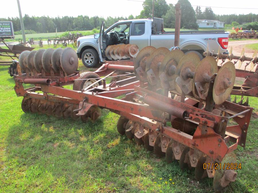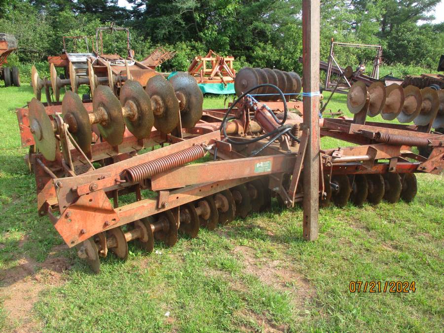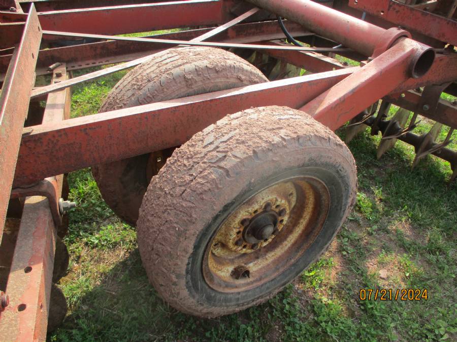 18' Disc harrow, tandem wheel, hyd cyl, spring wings, 56 plates, Oliver or White, needs some repair
