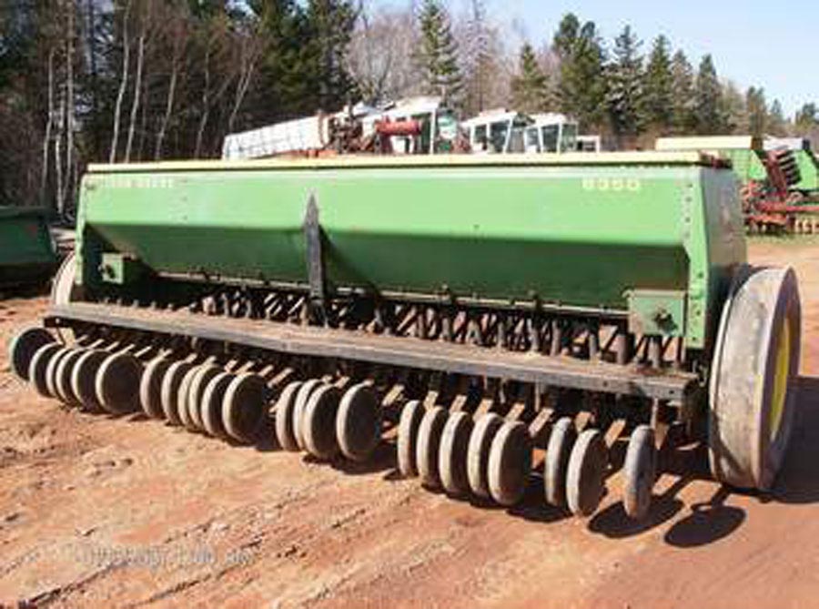 8350 JD grain drill, 24 run, 6" spacings, single disc, fertilizer & seed, packing wheels, field ready